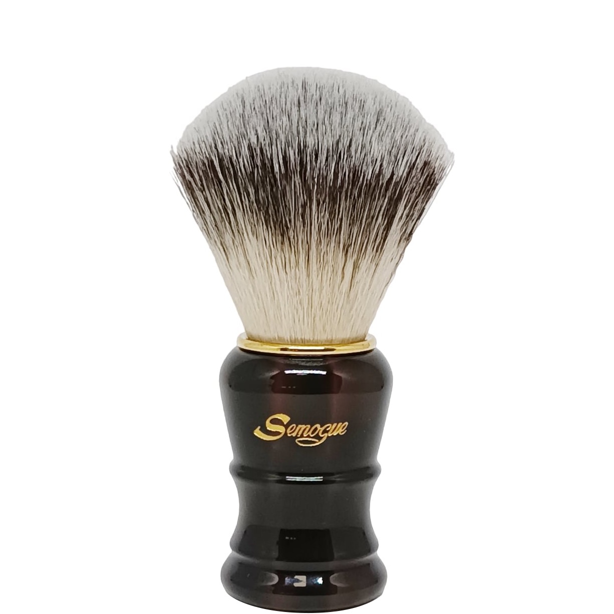 Het handvat van edelkunsthars in de kleur “schildpad“ – compleet met lasergravure en vergulde inleg van het Semogue beeldmerk en de stijlvolle messing ring maken deze scheerkwast, gecombineerd met deze fraaie haarbundel met kenmerkende warmer gekleurde ‘silvertips’, tot een klassieker.