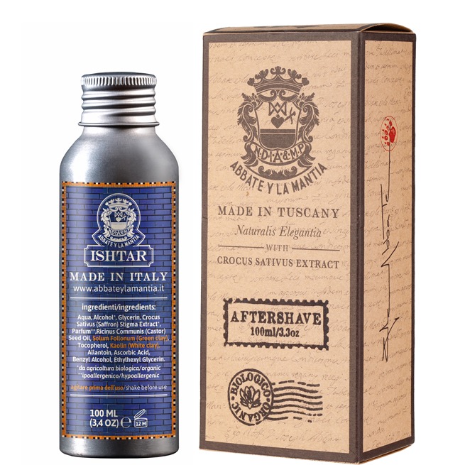 Dankzij de natuurlijke extracten van onder meer saffraan en castorsolie bezit de aftershave lotion een natuurlijk desinfecterende en verkoelende werking. Tevens herstellen de ingrediënten de onderhuidse microcirculatie én beschermen deze de geschoren huid tegen verontreinigende stoffen en schadelijke UV-straling. De formule van Abbate Y la Mantia is in Ishtar verrijkt met witte klei, groene klei en saffraan. Een coctail van cosmetische ingrediënten die sinds de oudheid worden gebruikt als het beste elixers voor schoonheid, gezondheid en jeugd.
